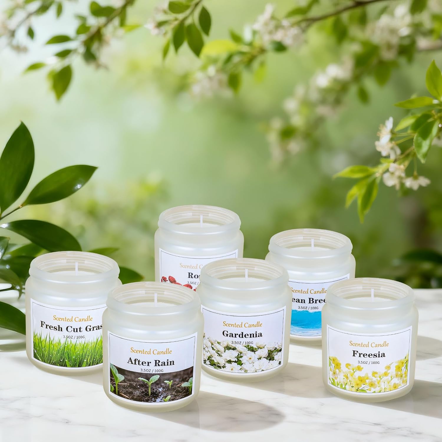 💐💐[Spring Candles for Home Scented]: Aeraroma carefully blended candles set brings you a complete 6 different scent experiences: After Rain │ Fresh Cut Grass │ Ocean Breeze │ Gardenia │ Freesia │ Rose, perfect for creating a cozy atmosphere. This thoughtfully designed candle set transforms your living space into a warm retreat, and each soy candle brings you a unique olfactory journey to the beautiful moments of every day